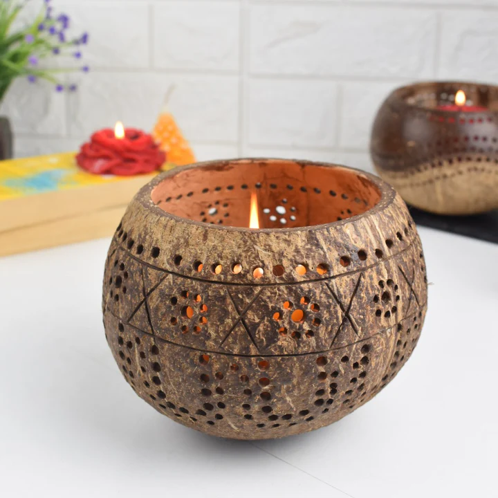 Thenga Hand Carved Coconut Shell Candle Holder - Eco-Friendly Diwali